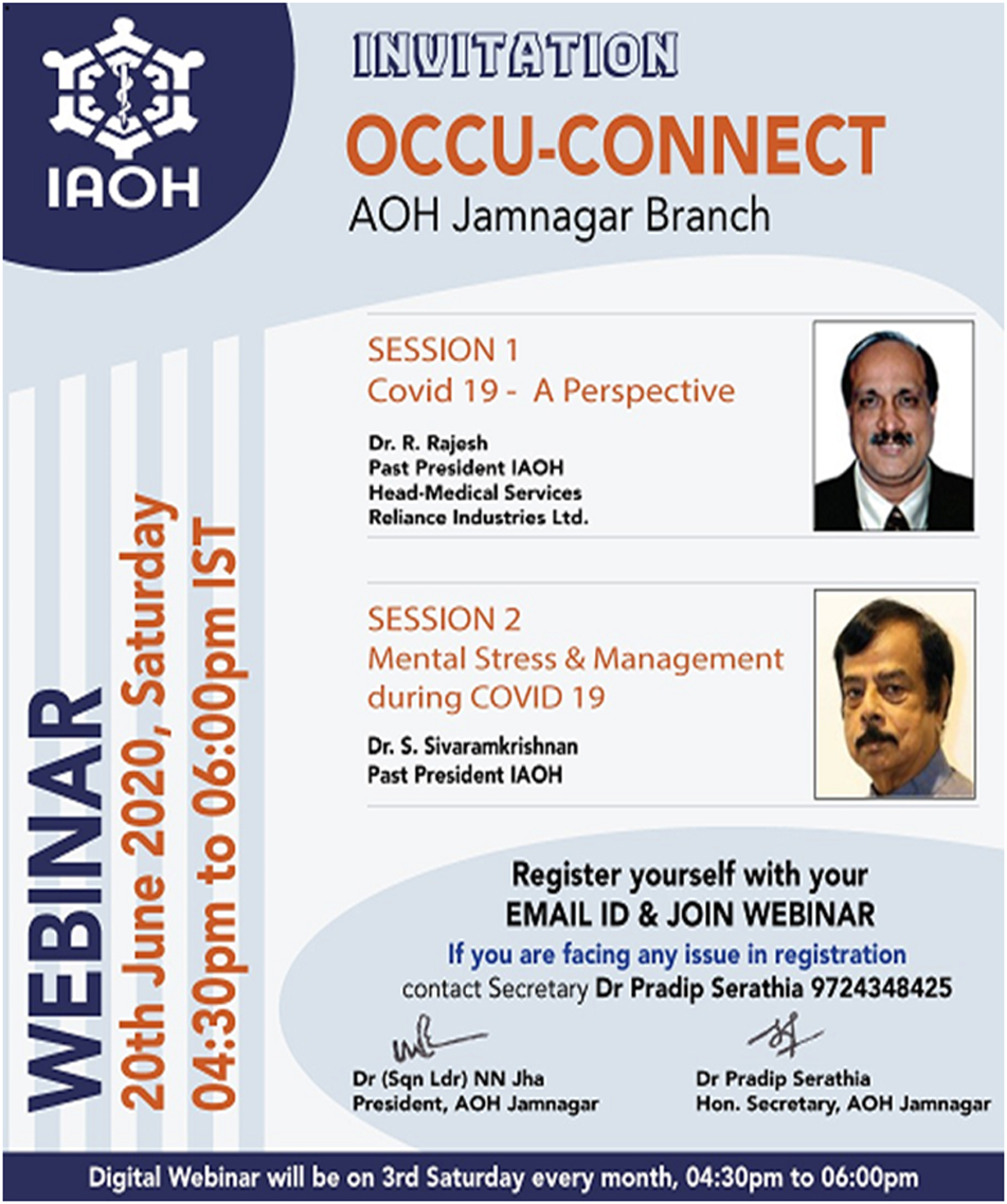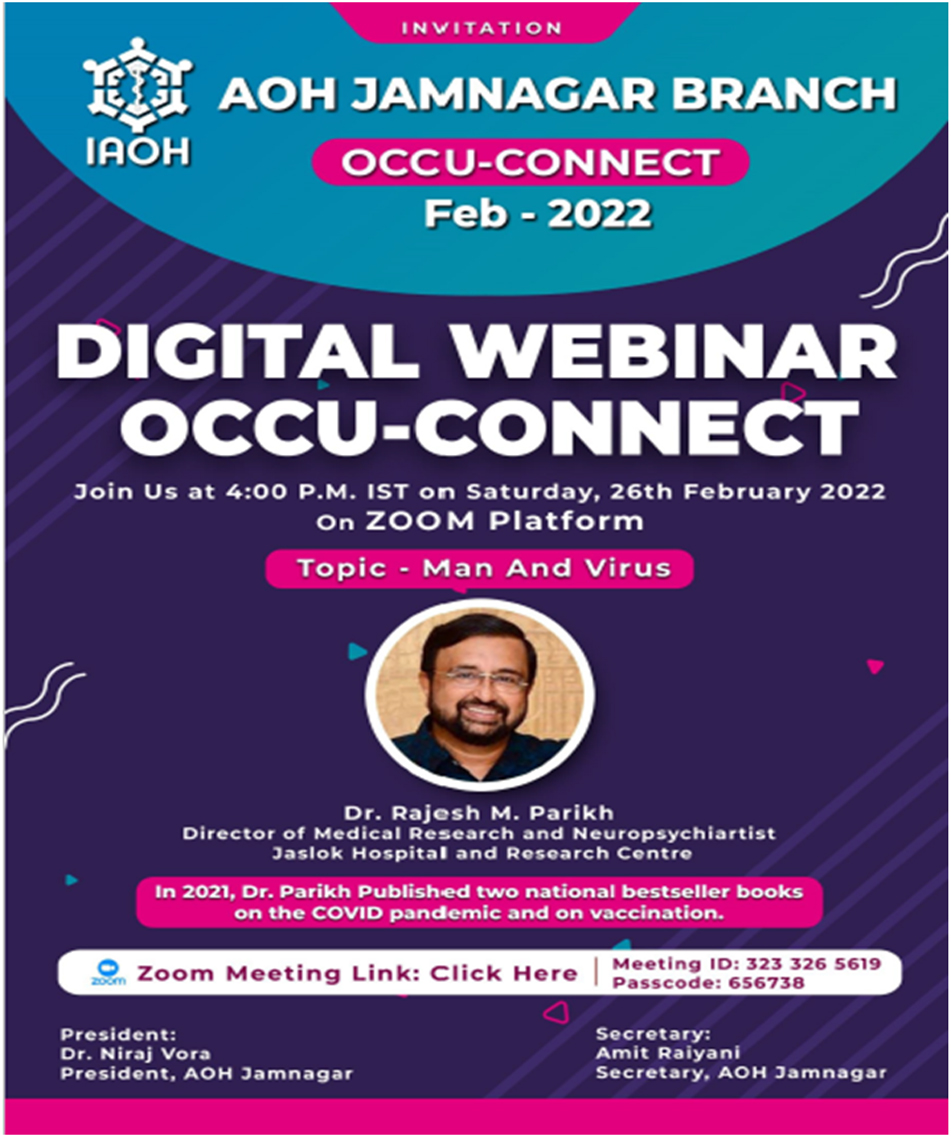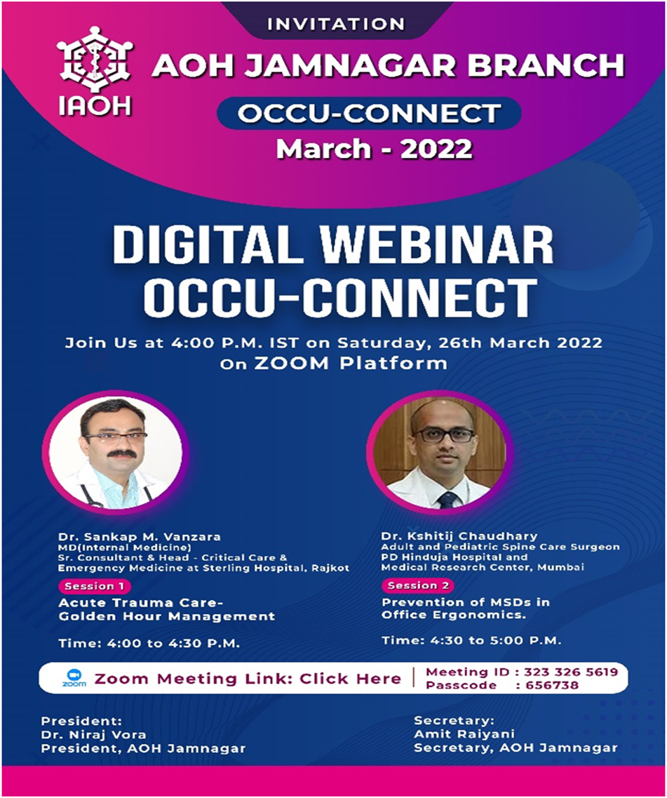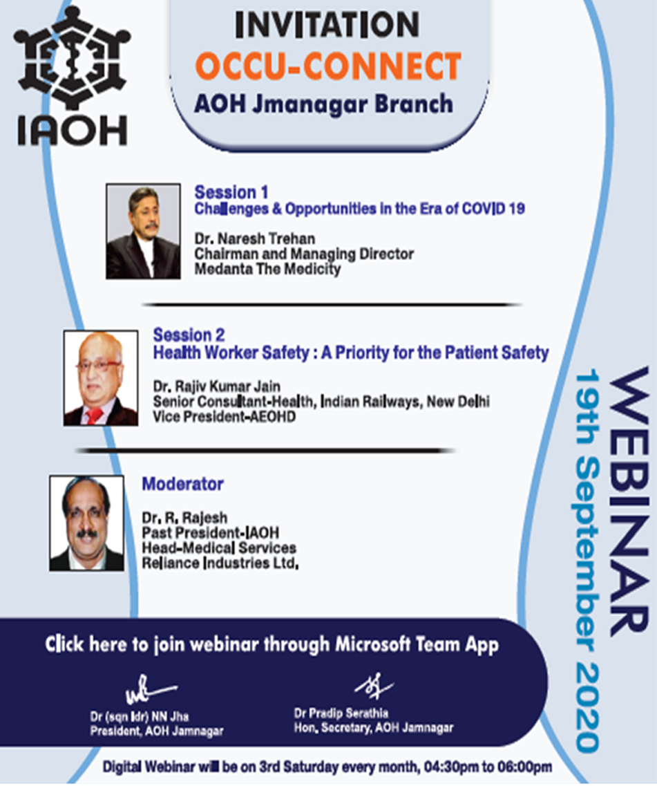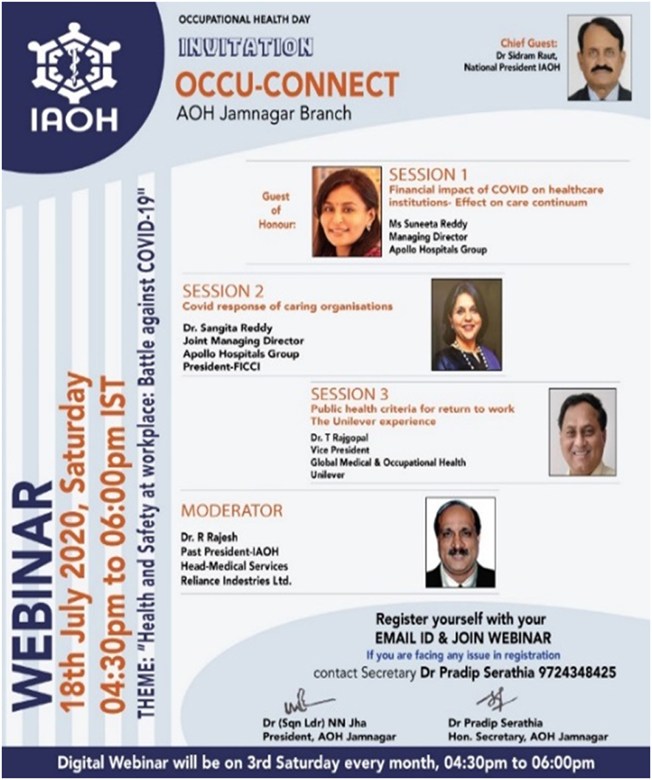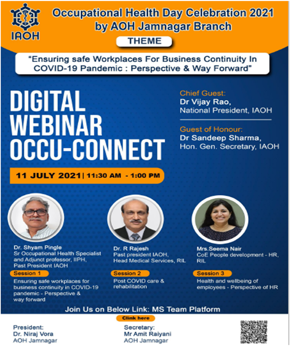 On Occasion of Occupational Health Day special webinar was organized by AOH Jamnagar branch on theme "Health and Safety at Workplace: Battle Against COVID-19" on 18th July 2020 at 04:30PM. Participants : 340