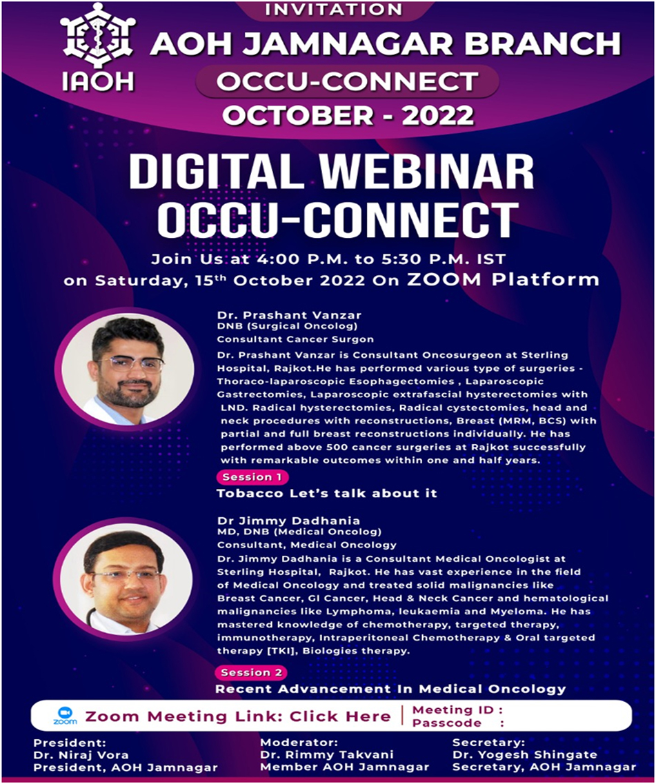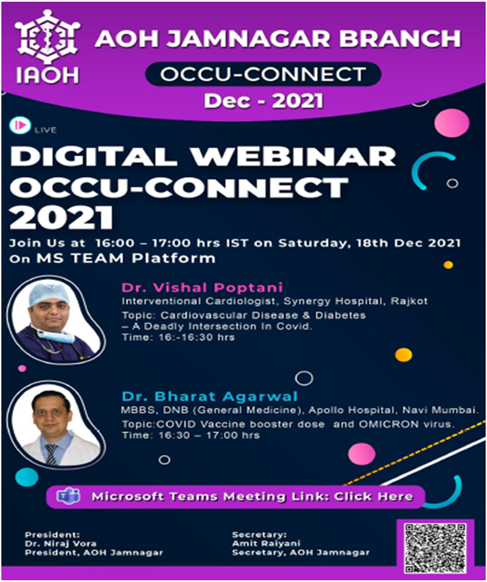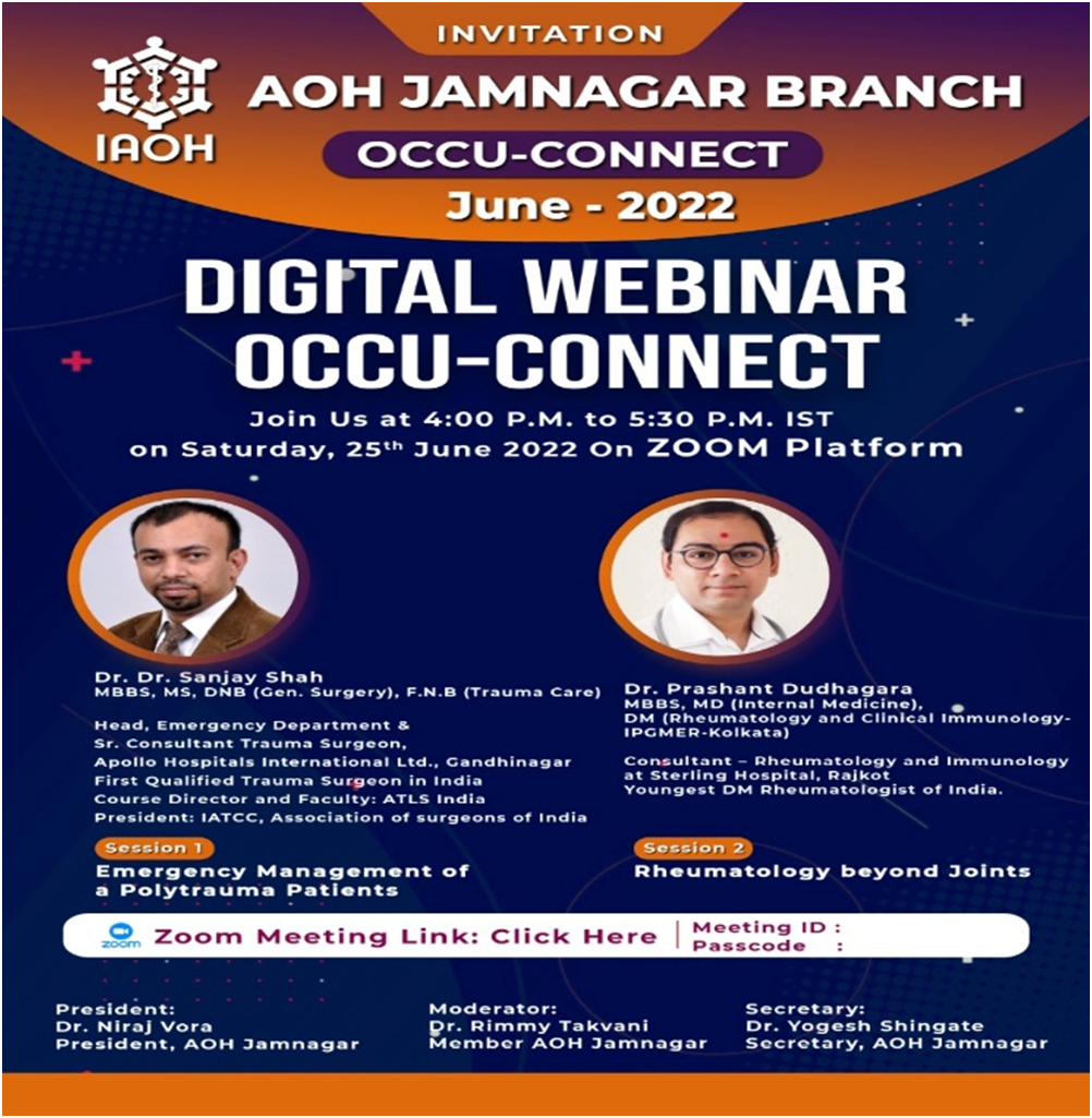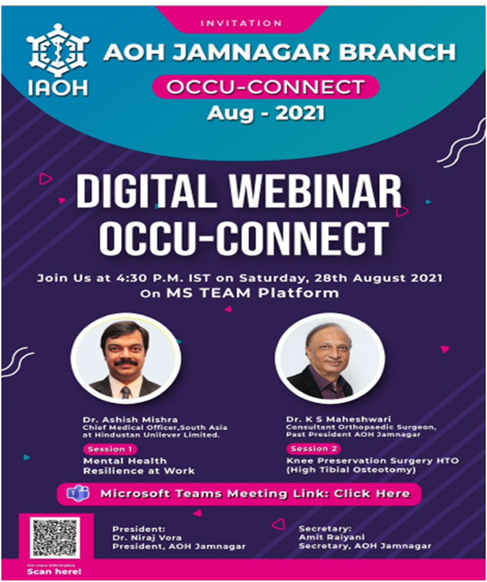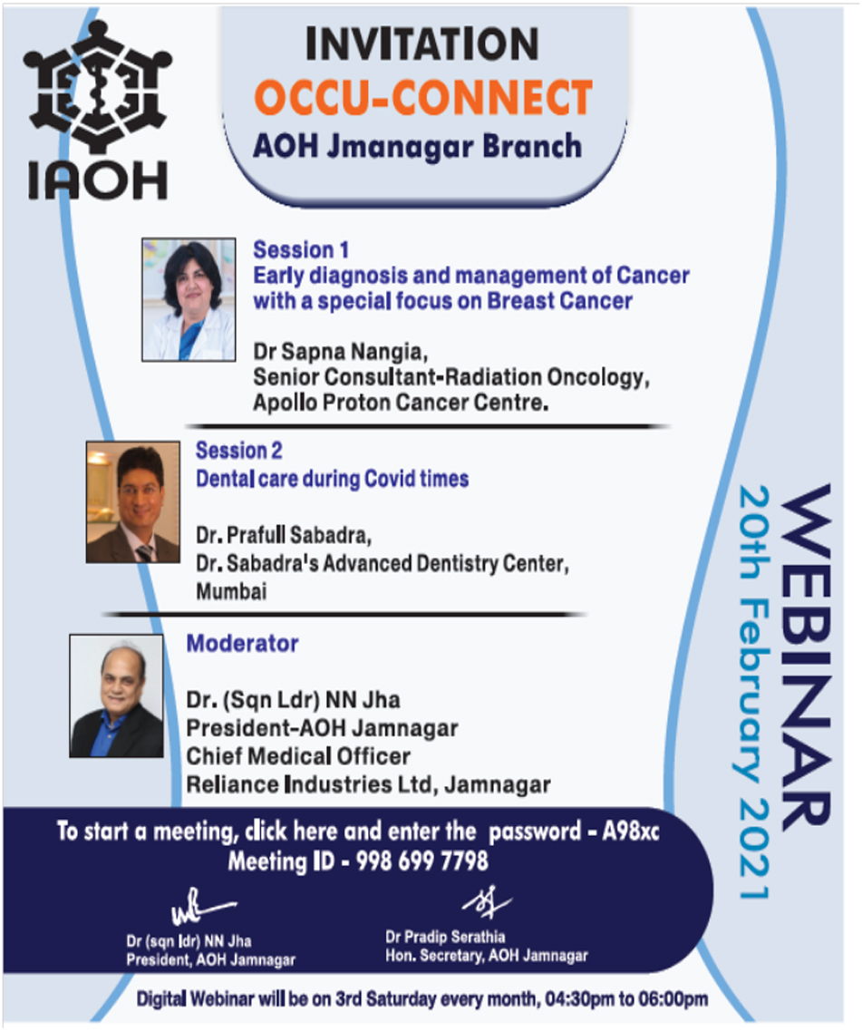 On Occasion of Occupational Health Day special webinar was organized by AOH Jamnagar branch on theme "Health and Safety at Workplace: Battle Against COVID-19" on 18th July 2020 at 04:30PM. Participants : 340