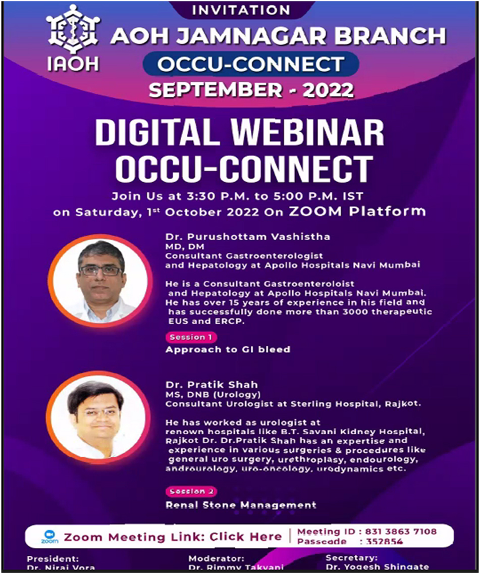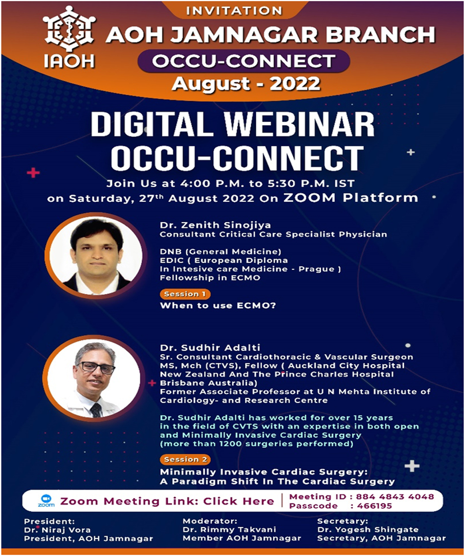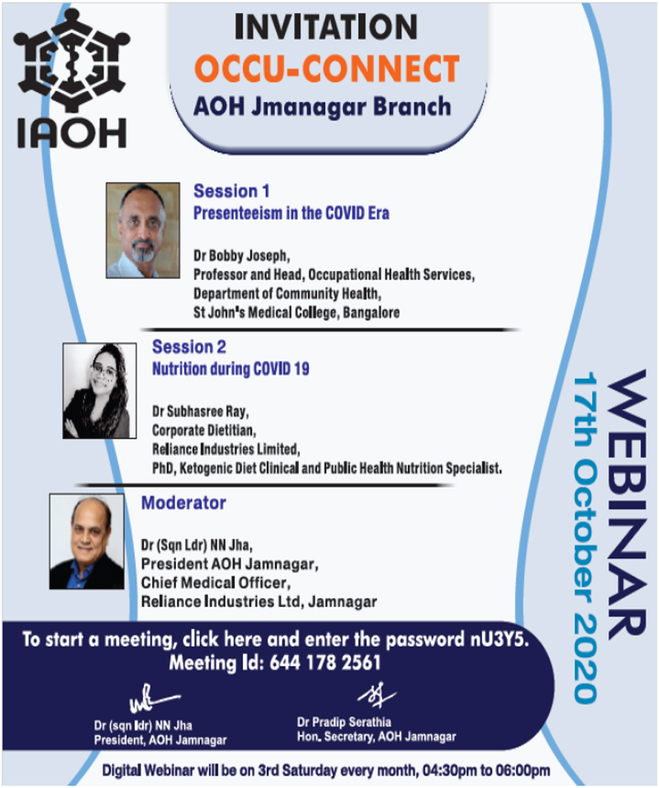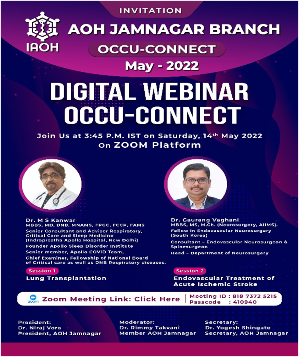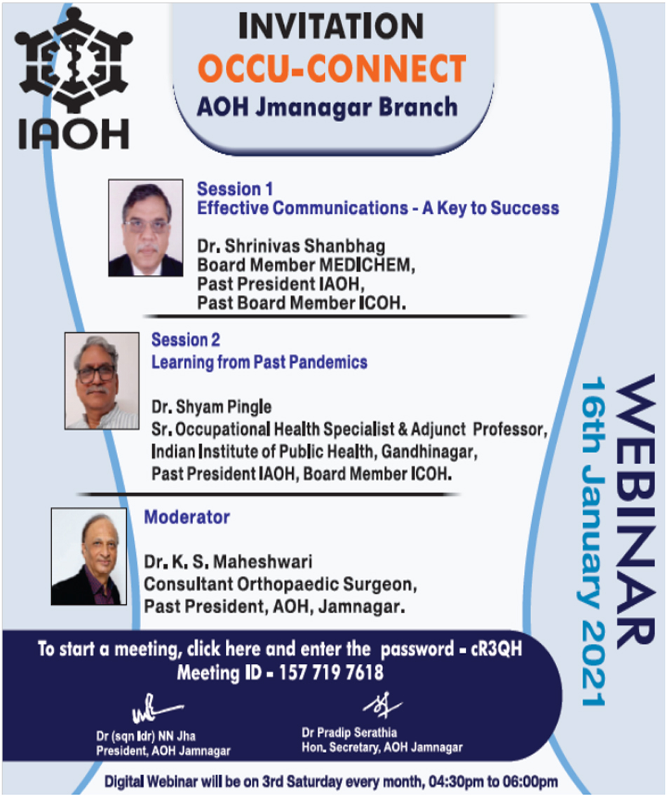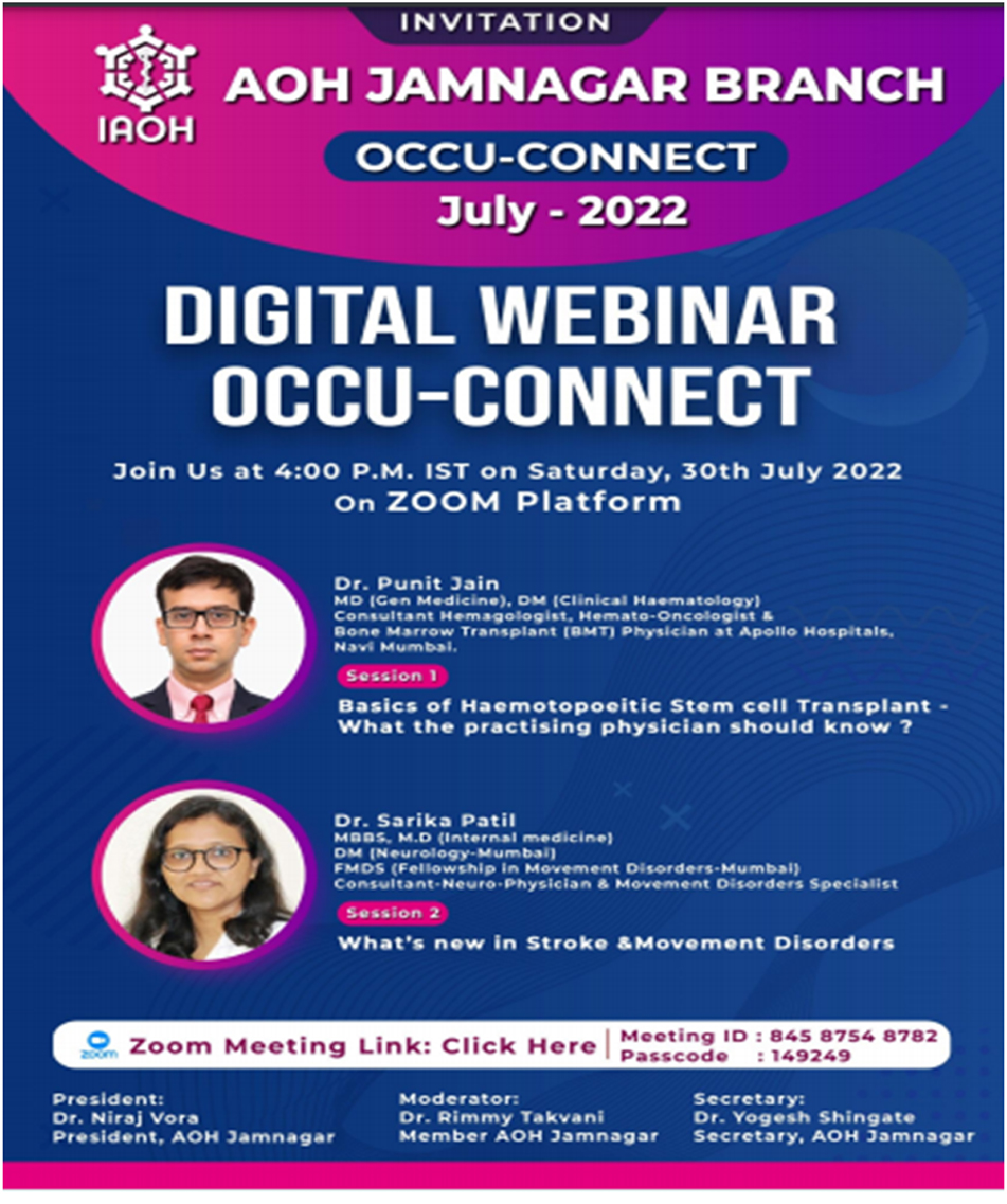 On Occasion of Occupational Health Day special webinar was organized by AOH Jamnagar branch on theme "Health and Safety at Workplace: Battle Against COVID-19" on 18th July 2020 at 04:30PM. Participants : 340